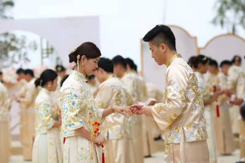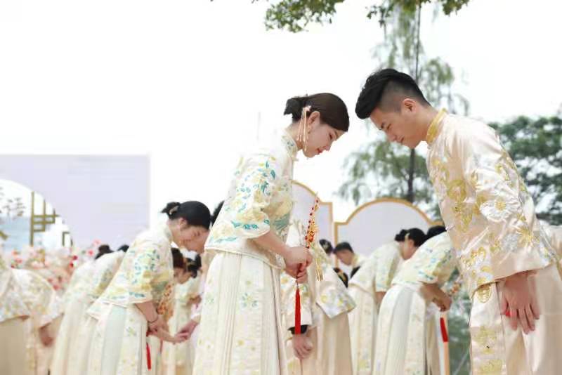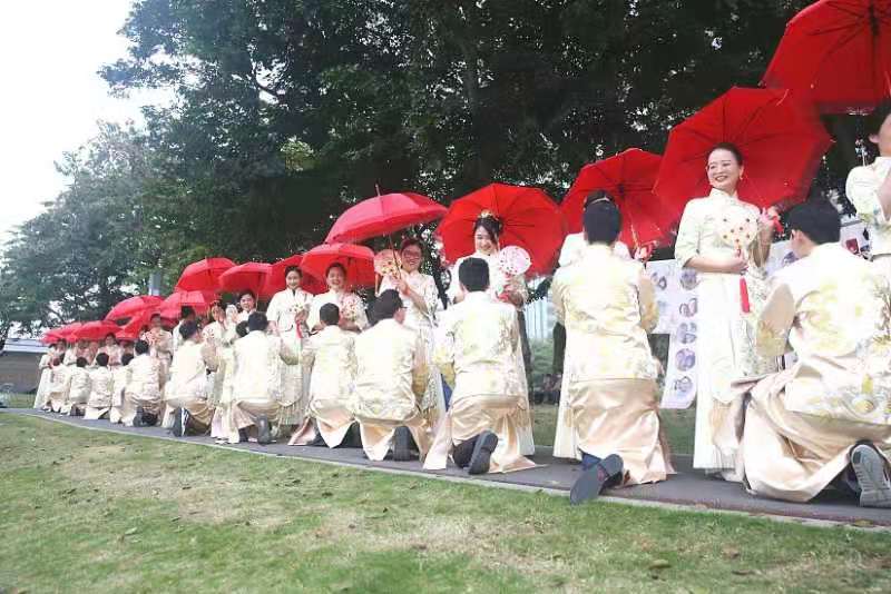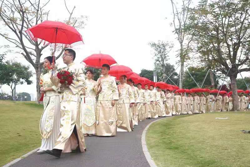 活動(dòng)伊始,新人手舉紅傘穿過(guò)連理橋,在玫瑰園情話闖關(guān),在中西禮堂進(jìn)行找新娘等默契互動(dòng),在自然展覽廳俯瞰香蜜公園全貌,與林立高樓與大片叢林相映成景的最美天際線合影,最后在氤氳浪漫的花香湖和花蜜湖畔,在親友與來(lái)賓的祝福下,40對(duì)新人身穿中式禮服,誦讀莊嚴(yán)的誓詞,許下今生不變的承諾。