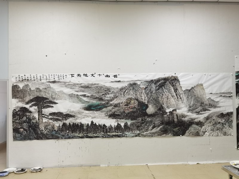 本次活動邀請的以李耀林先生為代表的十位畫家,都是當(dāng)代山水畫創(chuàng)作的高手,為體現(xiàn)“名家繪名山”活動的創(chuàng)作意義及交流價值,十位畫家精心策劃,構(gòu)思精巧地創(chuàng)作完成了一巨幅名山圖——《名山十大雄天下》。創(chuàng)作中,畫家們以各自創(chuàng)作特長及手法,將泰山、黃山、廬山、華山、五臺山、峨眉山、武夷山、武當(dāng)山、長白山、觀音山十大名山的代表性景點,融于畫中,一氣呵成。鄒繼海先生在名山圖上,欣然撰序題詞“名山十大雄天下”。李耀林先生介紹到,能夠在短期內(nèi)創(chuàng)作出融入十大名山精華元素的鴻篇畫作,十分講究技巧,是難得的創(chuàng)作佳話。此畫作將被名山文化與自然教育分會收藏、展出。