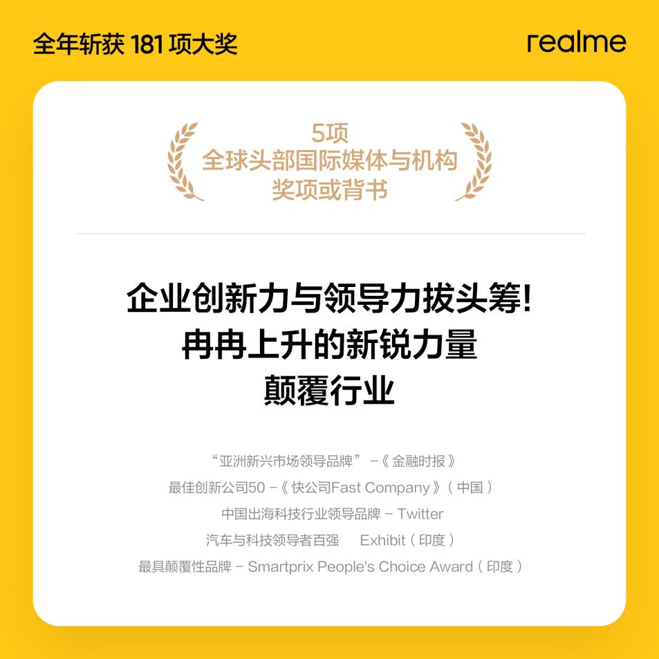 2020年,realme在全球斬獲了17個(gè)企業(yè)和品牌維度的獎(jiǎng)項(xiàng),企業(yè)創(chuàng)新力與領(lǐng)導(dǎo)力獲得業(yè)界認(rèn)可。國(guó)際權(quán)威媒體《金融時(shí)報(bào)》肯定了realme在亞太地區(qū)的領(lǐng)先地位。Financial Times、快公司、Twitter、Exhibi等媒體與機(jī)構(gòu)授予realme“亞洲新興市場(chǎng)領(lǐng)導(dǎo)品牌”、“最佳創(chuàng)新公司50”、“中國(guó)出海科技行業(yè)領(lǐng)導(dǎo)品牌”、“汽車與科技領(lǐng)導(dǎo)者百?gòu)?qiáng)”以及“最具顛覆性品牌”五項(xiàng)大獎(jiǎng)。realme品牌潛力不斷釋放,業(yè)界普遍認(rèn)為,在過(guò)去的一年里,realme品牌的增勢(shì)強(qiáng)勁,全球品牌價(jià)值在不斷躍升。