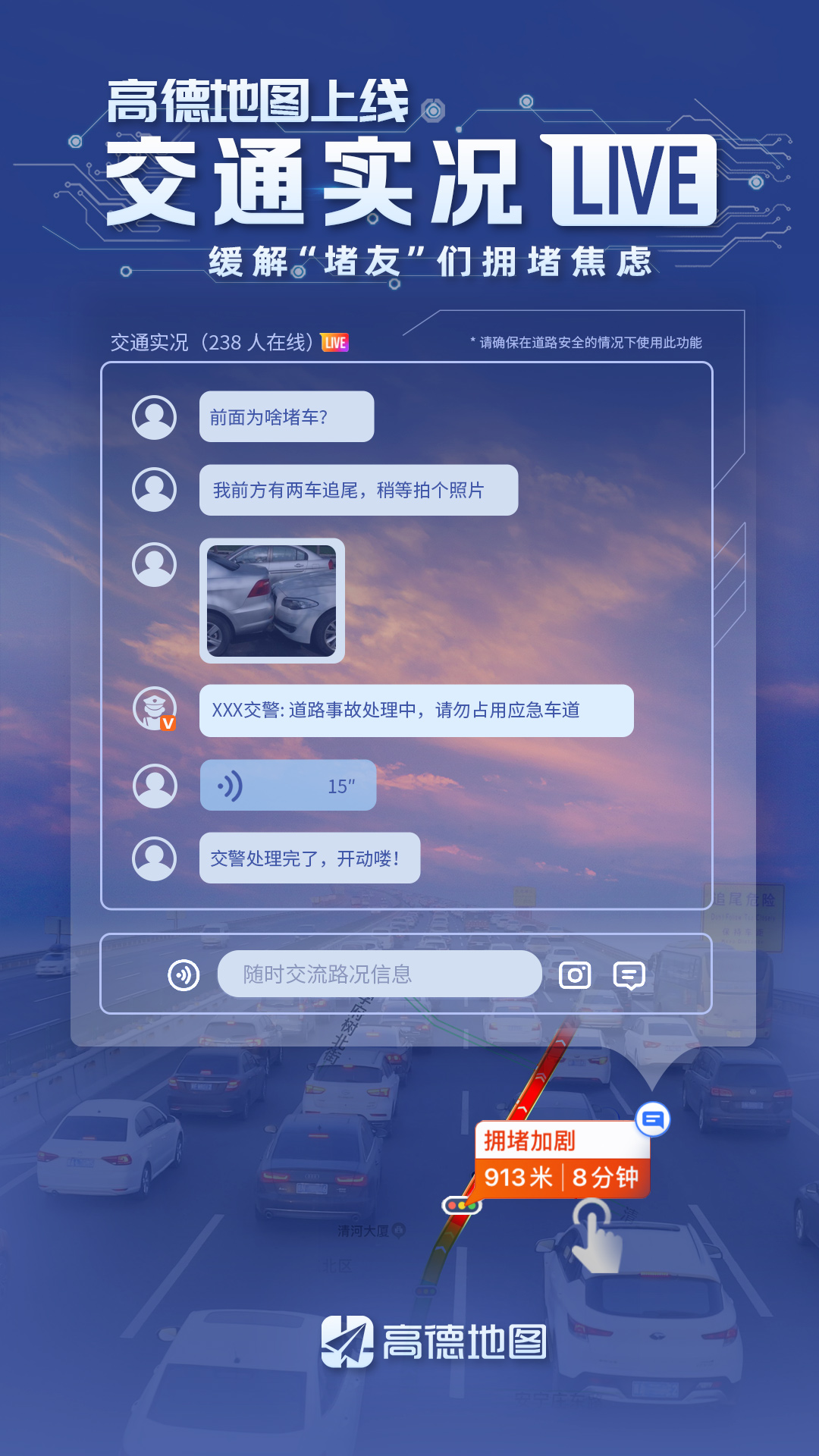 通過這個(gè)平臺,各地交管部門可及時(shí)發(fā)布擁堵事件的權(quán)威信息,如擁堵原因、派警情況、預(yù)計(jì)疏通用時(shí)及現(xiàn)場圖片等。當(dāng)用戶進(jìn)入嚴(yán)重?fù)矶侣范螘r(shí),通過點(diǎn)擊提醒氣泡即可進(jìn)入該界面,實(shí)時(shí)了解擁堵信息。在車輛因堵車無法行進(jìn)時(shí),“堵友”們還可以互通有無,通過文字、語音、圖片等多種方式,為后方司機(jī)分享第一手信息。而當(dāng)擁堵疏散時(shí),“交通實(shí)況”功能也將自動(dòng)關(guān)閉。