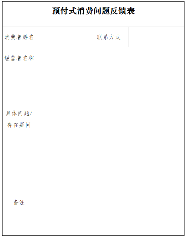 請(qǐng)?zhí)顚戭A(yù)付式消費(fèi)問題反饋表(附件)并發(fā)送至郵箱:szcc315law@m(xù)ail.a(chǎn)mr.sz.gov.cn。