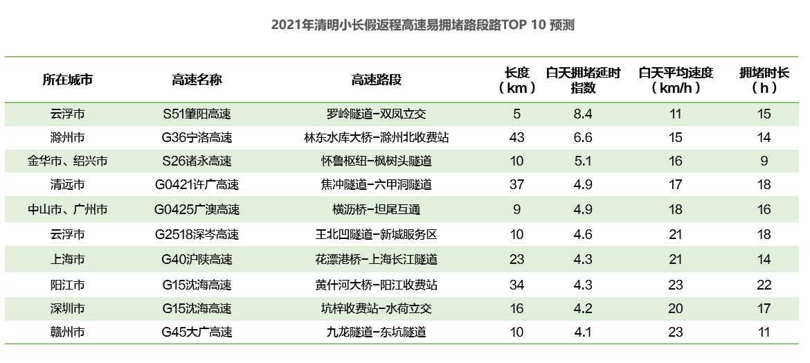 具體時段方面,預(yù)計2021年4月2日(清明小長假前一天)15時開始,全國高速交通壓力逐漸增大,20時至23時擁堵程度較高;4月3日(清明小長假第一天)8時至12時高速迎來出程擁堵高峰,預(yù)計10時至11時達(dá)峰值,4月5日(清明小長假最后一天)14時至19時為高速返程擁堵高峰。