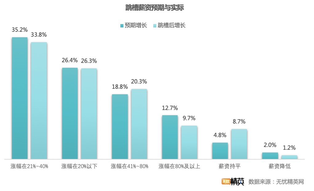 同時(shí)經(jīng)歷了一年的觀望、沉淀,職場(chǎng)精英在求職時(shí)不論是對(duì)工作城市、崗位還是薪資預(yù)期也更加理性。在兩組調(diào)研數(shù)據(jù)中,我們不難發(fā)現(xiàn)此次跳槽多數(shù)職場(chǎng)精英的薪資漲幅在21-40%之間,預(yù)期與實(shí)際增長之差僅有約3個(gè)百分點(diǎn)。這表明在職場(chǎng)精英對(duì)個(gè)人情況與行業(yè)崗位現(xiàn)狀做詳盡調(diào)查,預(yù)期管理科學(xué)合理。