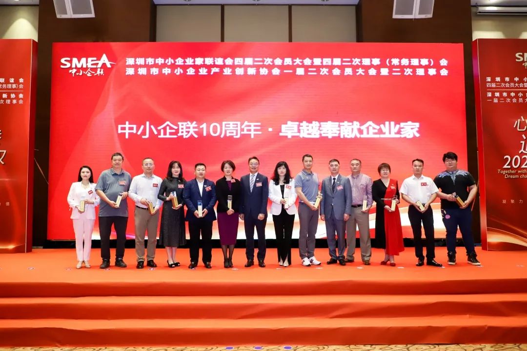 深圳市中小企業(yè)服務(wù)局副局長陳小林(左七)為獲得卓越貢獻(xiàn)獎的企業(yè)家頒獎