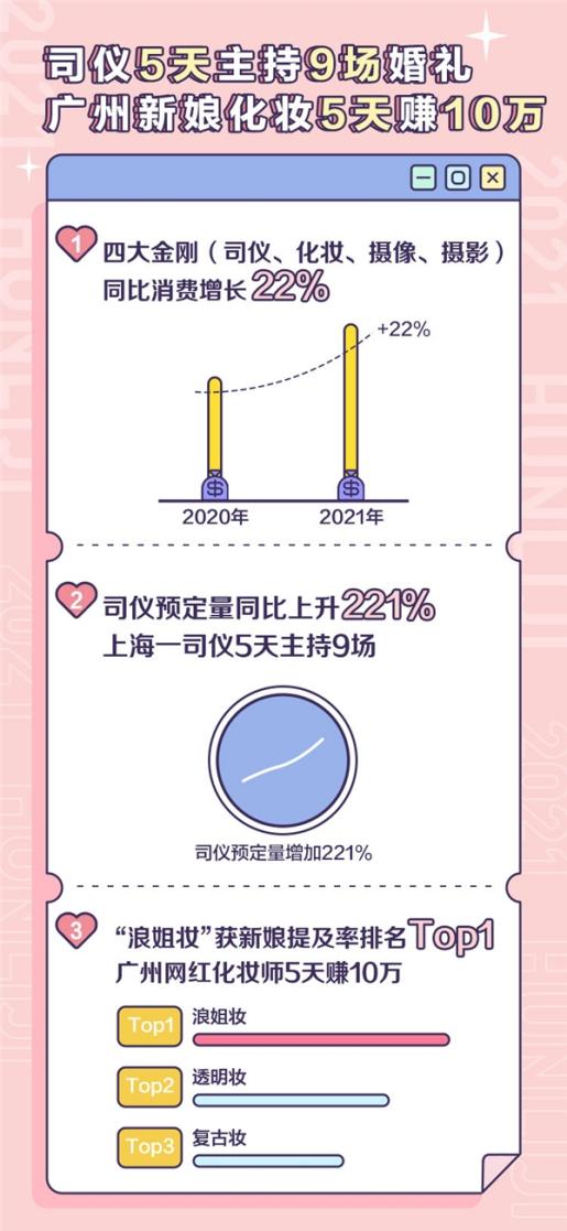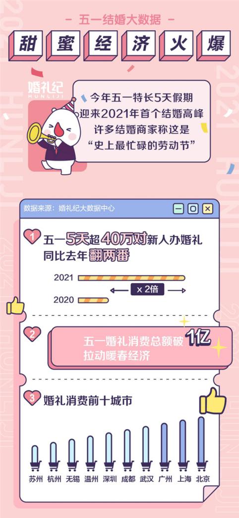 數(shù)據(jù)顯示,五一迎來2021年首個(gè)結(jié)婚高峰,5天內(nèi)超40萬對新人舉辦婚禮,同比去年翻兩番。五一婚禮消費(fèi)總額破1億,在一定程度上拉動暖春經(jīng)濟(jì)。婚禮消費(fèi)前十城市分別是北京、上海、廣州、武漢、成都、深圳、溫州、無錫、杭州、蘇州。
