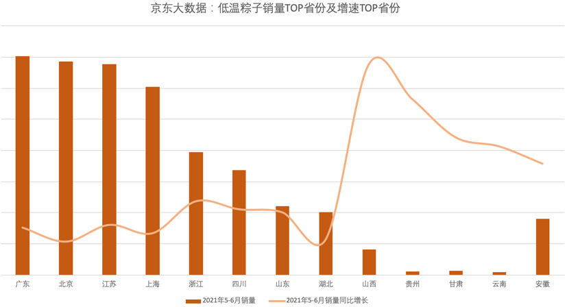 與低溫發(fā)展趨同的,還有平臺(tái)助力食品企業(yè)數(shù)字化和渠道完善帶來(lái)的整個(gè)行業(yè)對(duì)下沉市場(chǎng)的發(fā)掘——從銷量看北京、廣東及江浙滬等發(fā)達(dá)地區(qū)是低溫粽子的主要消費(fèi)區(qū)域,四川、山東、湖北等省緊隨其后。而隨著京東冷鏈和物流的下沉和完善,山西、貴州、甘肅、云南、安徽等省區(qū)的增速位列全國(guó)前五。
