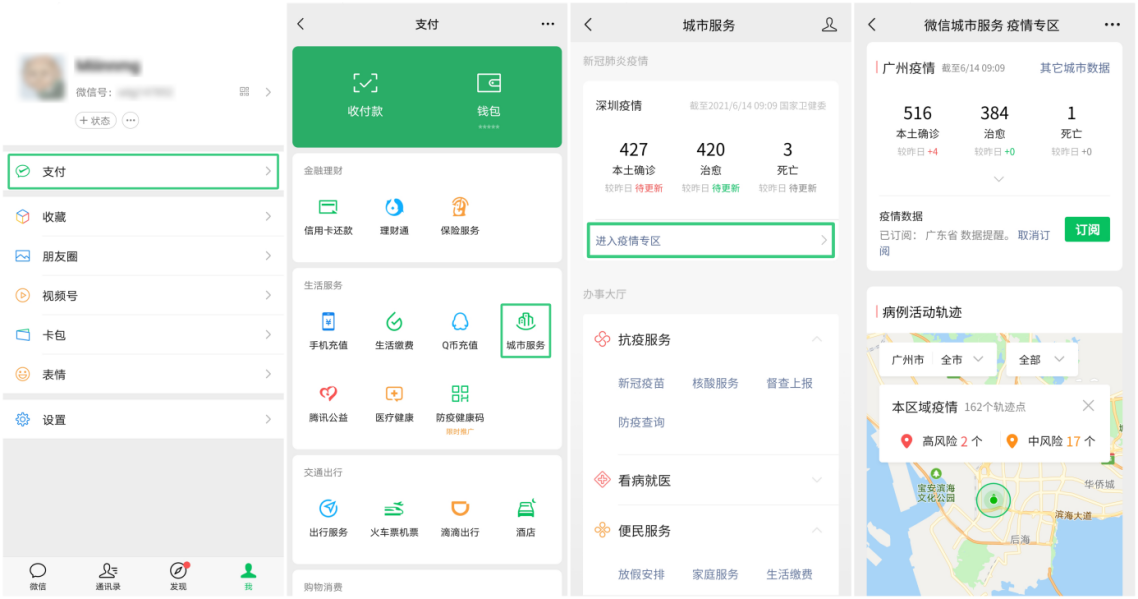 讀特客戶端·深圳新聞網(wǎng)2021年6月16日訊 (記者 田志強(qiáng))端午期間,為減少疫情傳播風(fēng)險(xiǎn),廣東市民紛紛響應(yīng)號(hào)召實(shí)行就地過節(jié),落實(shí)非必要不出省的相關(guān)要求。為進(jìn)一步助力廣東及全國(guó)人民抗疫,為市民提供準(zhǔn)確疫情資訊及抗疫服務(wù),近日,微信更新城市服務(wù)疫情專區(qū),支持查看疫情數(shù)據(jù)、病例活動(dòng)軌跡、疫情資訊以及接入抗疫服務(wù)。全國(guó)用戶打開“我-支付-城市服務(wù)-疫情專區(qū)”,即可快速觸達(dá)各類疫情相關(guān)服務(wù)。