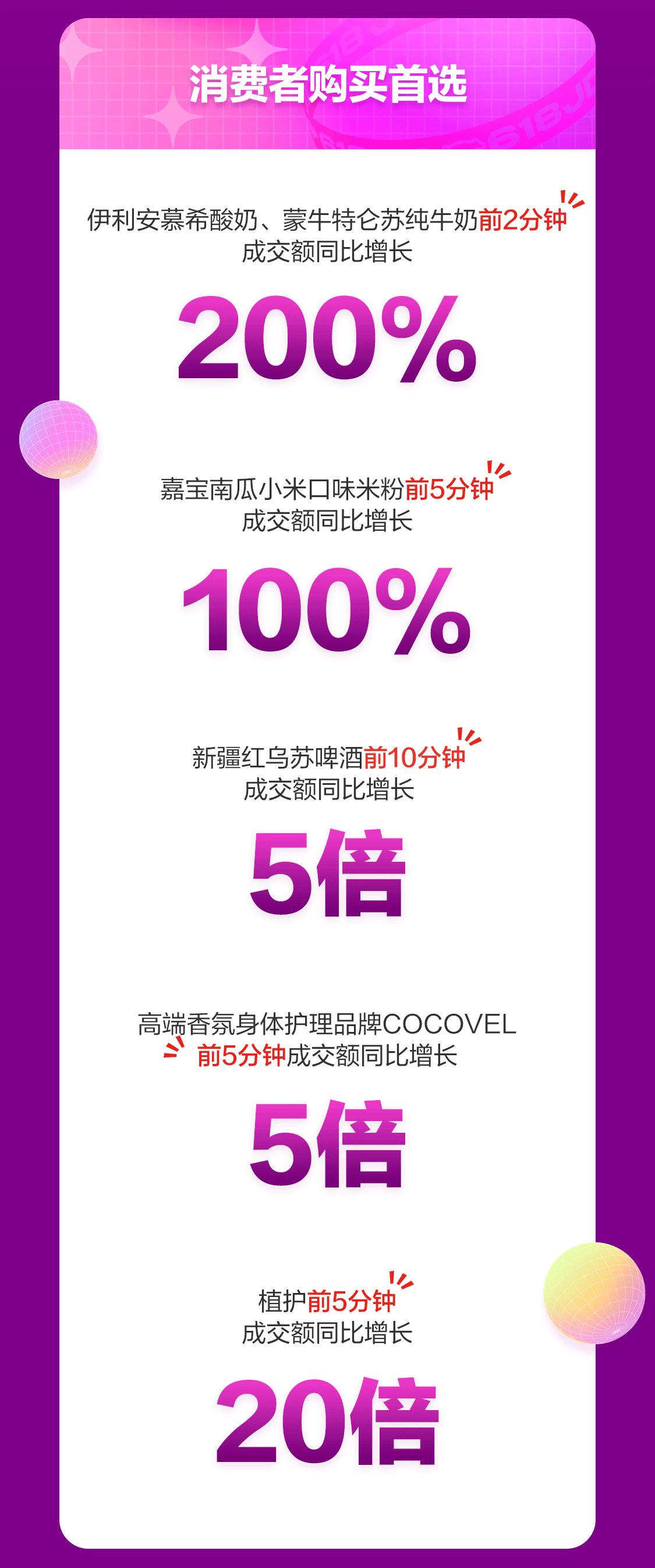 6月18日開(kāi)場(chǎng)前5分鐘,食品知名品牌增勢(shì)明顯。蒙牛前5分鐘成交額同比增長(zhǎng)超200%,福臨門(mén)前10分鐘成交額同比增長(zhǎng)112%,伊利前5分鐘成交額同比增長(zhǎng)超200%,其中伊利安慕希酸奶、蒙牛特侖蘇純牛奶兩款爆品前2分鐘成交額同比增長(zhǎng)200%。