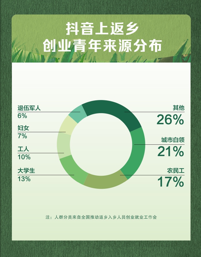 6月22日,抖音發(fā)布首份三農(nóng)數(shù)據(jù)報(bào)告(以下簡(jiǎn)稱“報(bào)告” )。過去一年,抖音農(nóng)村視頻總獲贊量129億,農(nóng)村視頻創(chuàng)作者收入同比增長15倍。抖音三農(nóng)創(chuàng)作者中,返鄉(xiāng)創(chuàng)業(yè)青年占比54%,城市白領(lǐng)返鄉(xiāng)創(chuàng)業(yè)比例最高,其次為農(nóng)民工。報(bào)告還從三農(nóng)創(chuàng)作者來源最多的省份縣域、最受歡迎的三農(nóng)視頻內(nèi)容等多角度解析目前抖音三農(nóng)內(nèi)容生態(tài)。