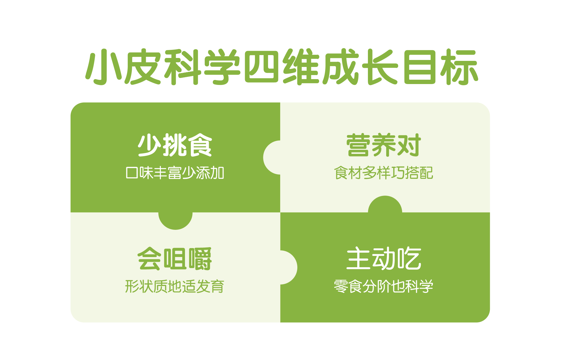 2017年,我國將“生命早期1000天營養(yǎng)健康行動”列為國民營養(yǎng)計劃重大行動之一,但相比孕產(chǎn)期與新生兒階段已覆蓋完善的營養(yǎng)指導(dǎo)來說,輔食階段的科學(xué)喂養(yǎng)關(guān)注程度與認知教育還有待提升。在此背景下,小皮基于嚴(yán)謹?shù)目茖W(xué)研究提出《6-36月齡嬰幼兒四維科學(xué)喂養(yǎng)方案》,并通過中國食品科學(xué)技術(shù)學(xué)會權(quán)威論證,旨在幫助寶寶建立起“少挑食、營養(yǎng)對、會咀嚼、主動吃”的健康飲食習(xí)慣。