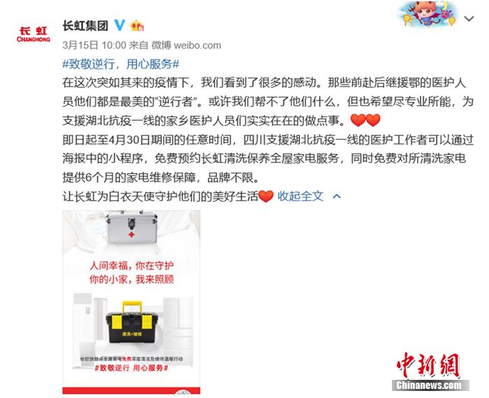 昨日,記者從長(zhǎng)虹集團(tuán)官方微博獲悉,長(zhǎng)虹快益點(diǎn)將為支援湖北抗疫一線的四川醫(yī)護(hù)工作者免費(fèi)清洗保養(yǎng)全屋家電,包括不限品牌的空調(diào)、冰箱、洗衣機(jī)、抽油煙機(jī)、電熱水器等。該項(xiàng)“特別福利”最高價(jià)值超過1800元,醫(yī)護(hù)工作者即日起可在4月30日前的任意時(shí)間預(yù)約。