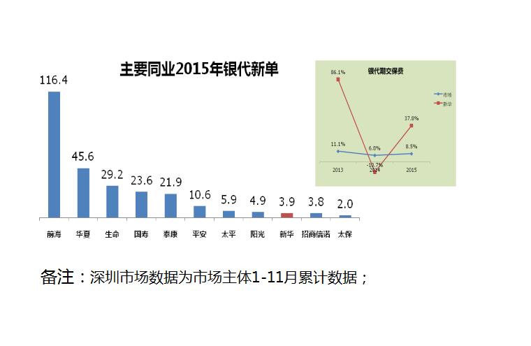 市場(chǎng)排名:2012-2015年,新華深分銀代期繳保費(fèi)年平均增長(zhǎng)率23%,市場(chǎng)同期增長(zhǎng)率為6%,銀代新單規(guī)模排名深圳市場(chǎng)第九。