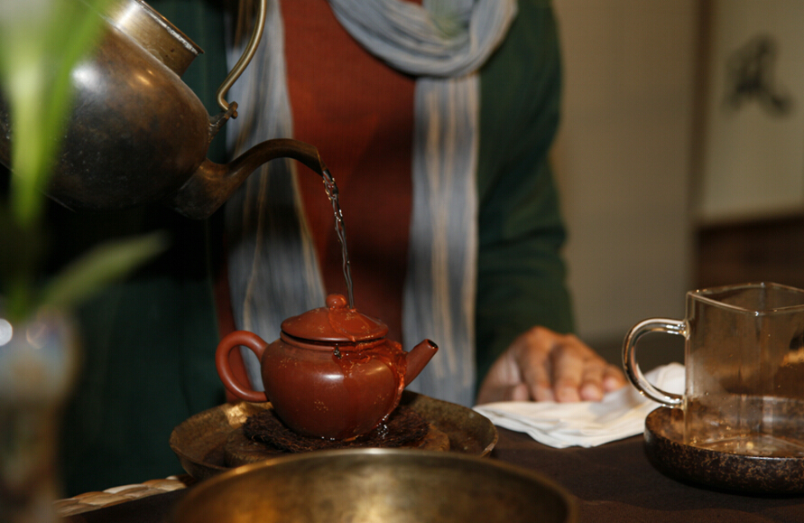 周三茶會的經(jīng)行禪茶創(chuàng)始人汪林生在進行禪茶表演