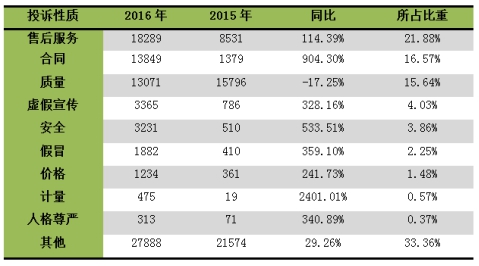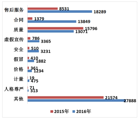由于投訴總量的激增,相對(duì)于2015年,除質(zhì)量問題之外,其他各類的投訴問題都增加,增加的幅度大多超過了1倍。如表3,圖4所示。