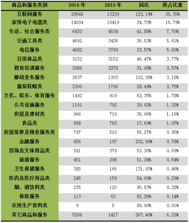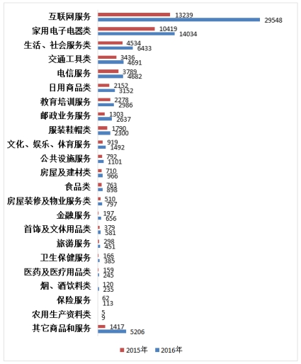 2016年商品和服務(wù)二十三大類投訴,相對(duì)2015年數(shù)量均有所增長?;ヂ?lián)網(wǎng)服務(wù)、家用電子電器類、生活社會(huì)服務(wù)類、交通工具、電信服務(wù)類五大類投訴量居前,分別占投訴總量的35.35%、16.79%、7.70%、5.61%和5.60%。