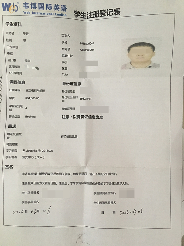 6節(jié)課,花費(fèi)34800元 投訴深圳市韋博國際英語培訓(xùn)中心單方合同條款,忽視消費(fèi)者權(quán)益。