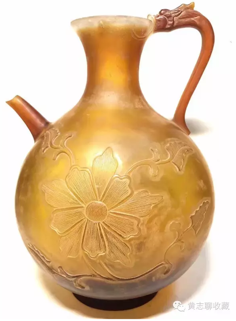 琉璃在唐代極為名貴。這從史書記載可窺一二。房玄齡的《晉書》中有關(guān)于琉璃器的記載“(王濟(jì))性豪侈,麗服玉食……帝嘗幸其宅,供饌甚豐,悉貯琉璃器中?!蓖鯘?jì)在招待皇帝時用了成套的琉璃碗盤,以逞其豪富,可見當(dāng)時琉璃器之貴重或要超過金、銀等器。又如宋代司馬光主編的《資治通鑒》中記載了這樣一段歷史事實:嶺南節(jié)度使路嗣恭在平息叛亂中趁機(jī)劫掠商民,得到了大批財物。他把其中一個直徑九寸的琉璃盤獻(xiàn)給了唐代宗。唐代宗非常高興,“以為至寶”。法門寺地宮出土的唐代琉璃器大多為皇家捐贈的禮佛之物也可佐證其珍貴。 這件執(zhí)壺為琉璃材質(zhì),高20cm、腹徑14.5cm,色澤黃褐,半透明,晶瑩潤澤,光澤柔和。小口,束頸,腹部圓鼓,餅足;前有直流,后為龍柄。整體形制穩(wěn)重大方,圓潤飽滿,具有典型的唐代特征。壺身兩面刻有菊紋,線條流暢自然,勁健有力。整體透入出唐人的灑脫自信。這類唐代的琉璃作品存世極少,目前為數(shù)不多的一些作品大多出自窖藏、地宮及貴族墓葬,屬于珍稀文物。此件執(zhí)壺保存完整,尤為難得。 欣賞更多藏品,歡迎瀏覽【黃志博物館】網(wǎng)站:www.huangzhimuseum.com?