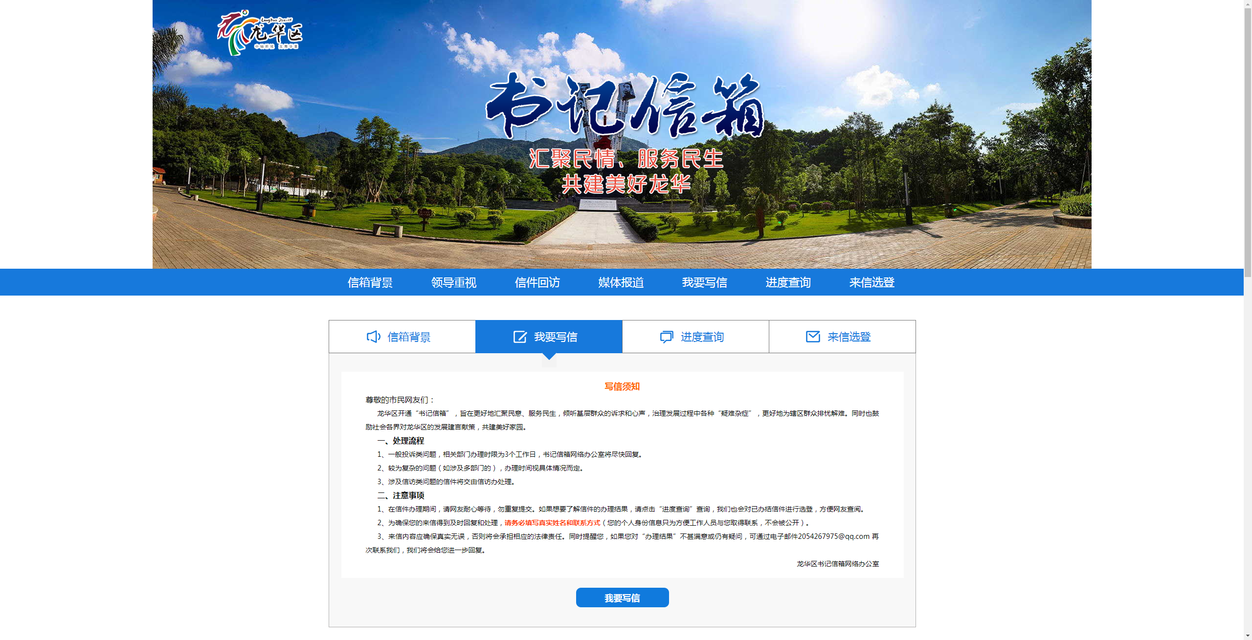 龍華區(qū)“書記信箱”網(wǎng)絡(luò)平臺是由龍華區(qū)領(lǐng)導的指導下搭建的網(wǎng)絡(luò)信息平臺,由深圳新聞網(wǎng)團隊進行開發(fā)搭建?!皶浶畔洹钡臉?gòu)建,是龍華區(qū)委貫徹落實黨的群眾路線,踐行“三嚴三實”的一項新舉措?!皶浶畔洹弊?015年10月31日正式上線以來,逐步成為龍華市民向龍華區(qū)委反映、提出建議、意見和投訴請求的重要渠道。