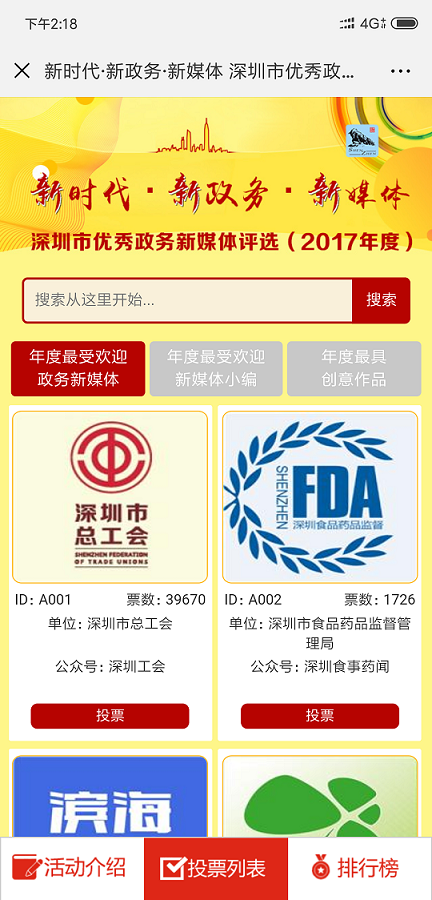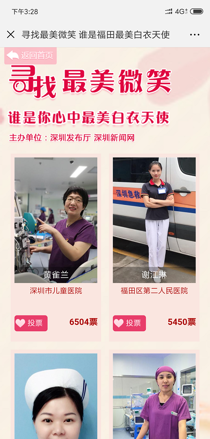 ② 多個投票活動已經(jīng)形成良好群眾效應(yīng),合作方主辦方多屆舉辦,每屆舉辦均由深圳新聞網(wǎng)負責(zé)投票系統(tǒng)開發(fā),例如:健康場所投票、集團攝影大賽評選投票、政務(wù)類投票。形成了良好品牌效應(yīng)和示范,往往一個區(qū)舉辦的投票活動其他區(qū)會跟進舉辦,形成系列投票,例如:“最美護士”系列投票,“最美醫(yī)生”系列投票,“最美教師”系列投票,“最佳政務(wù)”系列投票等;