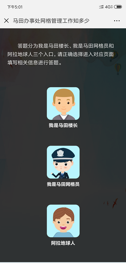 隨著當(dāng)前光明新區(qū)經(jīng)濟(jì)和社會(huì)的飛速發(fā)展,網(wǎng)格巡查管理工作環(huán)境日趨復(fù)雜。為此,馬田辦事處以社區(qū)網(wǎng)格化為抓手,積極帶領(lǐng)業(yè)主、樓長(zhǎng)、住戶主動(dòng)參與到樓棟的管理和社區(qū)的建設(shè),使他們從小“家”邁向大“家”,家家參與、人人行動(dòng),讓安全文明新風(fēng)形成常態(tài),營(yíng)造生機(jī)勃勃、欣欣向榮的社會(huì)氛圍,在馬田轄區(qū)打造共建共治共享社會(huì)治理格局?!榜R田辦事處網(wǎng)格管理工作知多少”線上有獎(jiǎng)競(jìng)答活動(dòng),由光明新區(qū)馬田辦事處主辦,馬田社區(qū)網(wǎng)格管理中心承辦。此次答題活動(dòng)自8月15日9點(diǎn)啟動(dòng),截止至8月19日23點(diǎn)59分,為期5天。答題分為“我是網(wǎng)格員”入口、“我是樓長(zhǎng)”入口和“阿拉地球人”三個(gè)入口。通過樓長(zhǎng)入口進(jìn)入的用戶,需輸入馬田轄區(qū)樓長(zhǎng)身份證或港澳通行證號(hào)方可答題,網(wǎng)格員入口則需輸入馬田轄區(qū)網(wǎng)格員有效證件號(hào)碼進(jìn)入對(duì)應(yīng)的答題頁(yè)面。在每次答題時(shí),答題系統(tǒng)將隨機(jī)抽取10道題,用戶須在120秒的時(shí)間內(nèi)完成,答對(duì)8題以上即視為闖關(guān)成功,可獲得一次抽獎(jiǎng)機(jī)會(huì),有機(jī)會(huì)獲得100元、50元、10元、5元、2元不等的微信紅包。