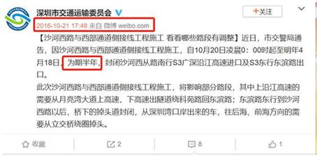 據(jù)市交委于2016年10月21日發(fā)布的通告稱,沙河西路與西部通道側(cè)接線工程(即東濱路隧道匝道工程)的施工時間計(jì)劃為2016年10月20日凌晨0:00時起至2017年4月18日,為期半年。期間將封閉沙河西從路南行s3廣深沿江高速進(jìn)口及s3東行東濱路出口。