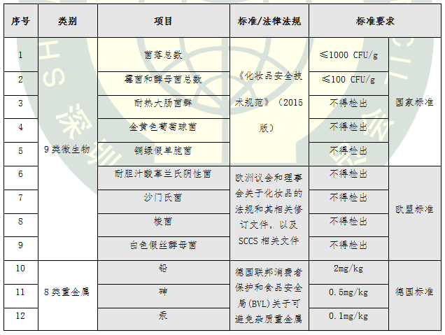 本次比較試驗檢測項目廣泛征求了企業(yè)、業(yè)內(nèi)專家和第三方檢測機構(gòu)的意見,不僅依據(jù)了現(xiàn)行國家標準,而且在國標基礎上結(jié)合嚴格的歐盟標準 《歐盟化妝品法規(guī)EC1223/2009及其相關(guān)修訂文件》、《歐盟消費者安全科學委員會(SCCS)關(guān)于化妝品安全的第九版指南》、德國聯(lián)邦消費者保護和食品安全局(BVL)關(guān)于可避免雜質(zhì)重金屬限值的調(diào)查報告、美國《聯(lián)邦食品、藥品和化妝品法案》、日本厚生勞動省《藥事法》以及其它相關(guān)標準、法規(guī)和技術(shù)文件的要求,采用國家標準檢測方法、實驗室通用方法等手段進行檢測,從44項指標展開氣墊粉底安全性品質(zhì)大比拼,詳細項目與要求見表1。