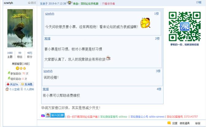 記者從問(wèn)政平臺(tái)得知,5月底以來(lái),還有市民發(fā)帖反映,除華潤(rùn)萬(wàn)家外,科技園萬(wàn)象天地華潤(rùn)Ole、僑香路沃爾瑪?shù)瘸幸泊嬖诓惶峁┘堎|(zhì)購(gòu)物小票的情況。目前,市民仍然普遍認(rèn)同超市應(yīng)主動(dòng)提供紙質(zhì)購(gòu)物小票,避免顧客被價(jià)格欺詐。有市民表示:“遇到最多的是優(yōu)惠打折,實(shí)際還是原價(jià)買(mǎi)單,這時(shí),手中有小票一目了然,不花冤枉錢(qián)?!边€有市民質(zhì)疑,“奸商,動(dòng)不動(dòng)就打著環(huán)保這些高大上的理由作借口”。同時(shí),也有市民體驗(yàn)過(guò)微信小票后表示,“沃爾瑪手機(jī)掃碼付款是沒(méi)有紙票,購(gòu)物小票藏在微信公眾號(hào)里,退換貨就在那里面進(jìn)行。這就是科技發(fā)達(dá)帶來(lái)的豐碩成果,挺好的。”截至記者發(fā)稿時(shí),市民關(guān)于科技園萬(wàn)象天地華潤(rùn)Ole、僑香路沃爾瑪?shù)瘸胁惶峁┵?gòu)物小票的帖文還沒(méi)有得到相關(guān)部門(mén)回應(yīng)。