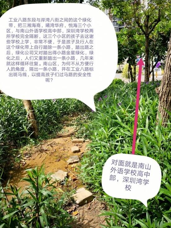 同時(shí),該市民還反映在工業(yè)八路東段與岸灣八街之間存在三個(gè)小區(qū)和兩個(gè)學(xué)校,周邊居民和孩子為了圖方便,在綠化帶上自行踏出了一條小路,綠化公司有對小路進(jìn)行綠化處理,但是處理過后,居民和孩子又會重新踏出一條,幾年來就這樣循環(huán)往復(fù)。并呼吁相關(guān)部門在此綠化帶修一條小路,在工業(yè)八路標(biāo)出斑馬線,提高孩子過馬路的安全性。
