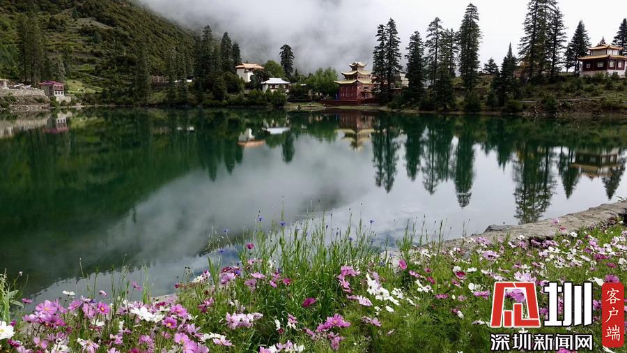 湖的四周是森林和由措卡寺寺僧主持修建的藏傳佛教各色建筑,它們時(shí)而云遮霧障,時(shí)而與藍(lán)天白云一起倒映在湖中。李仁奇攝