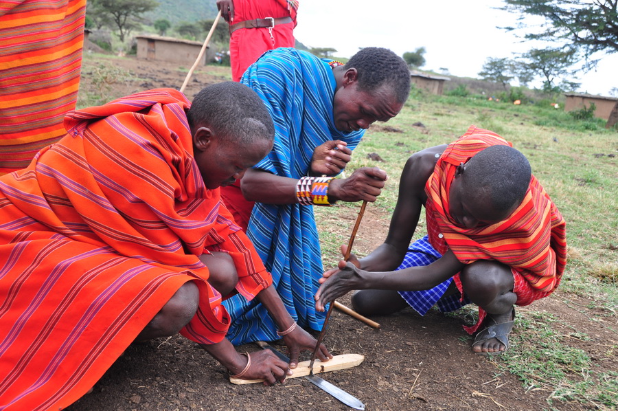 馬賽人盛行一夫多妻制。成年男子蓄發(fā)編成小辮,年輕婦女剃光頭。近年來,定居的馬賽兒童開始上學,已出現(xiàn)少數(shù)馬賽人知識分子。圖為為游客表演鉆木取火等節(jié)目的馬賽人。李仁奇 攝