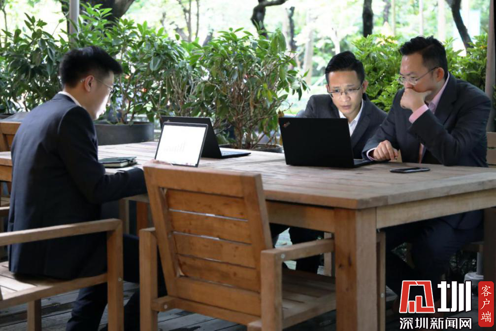 黃宇華(右一)與同事交流業(yè)務(wù)