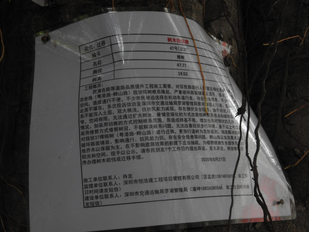 9月11日,市交通運輸局羅湖管理局回應(yīng)表示,稱“經(jīng)核實,百世路西段北側(cè)(畔山路以西)樹木為大葉榕,屬于榕樹的一種,榕樹有多種,如小葉榕、大葉榕、高山榕、垂葉榕等,百世路榕樹現(xiàn)狀根系已確實對人行道造成破壞?!睂τ谄渌鼧浔豢车那闆r,“僅對影響道路轉(zhuǎn)彎半徑(畔山路右轉(zhuǎn)百世路)的兩棵鳳凰樹遷移砍伐”。并在不影響遮陰的情況下“對北側(cè)過密其他喬木進行抽梳”。