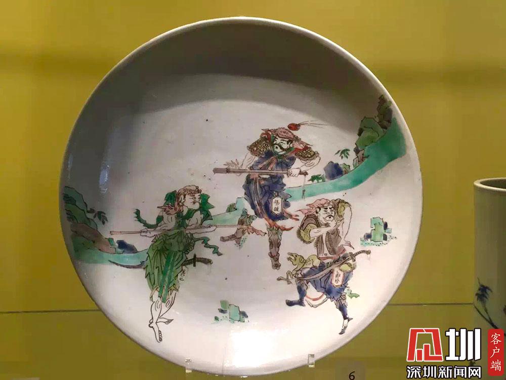 另一款水滸故事粉彩盤上,三個(gè)人物都有姓名,分別是:楊雄、解珍、阮小七。