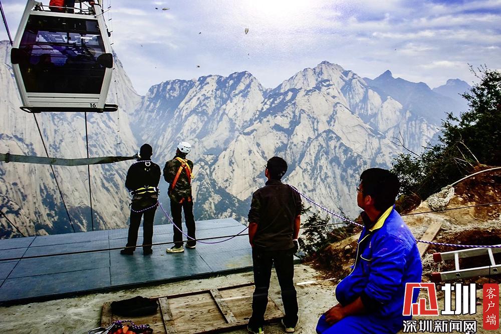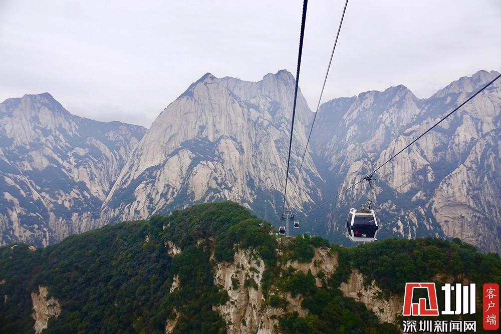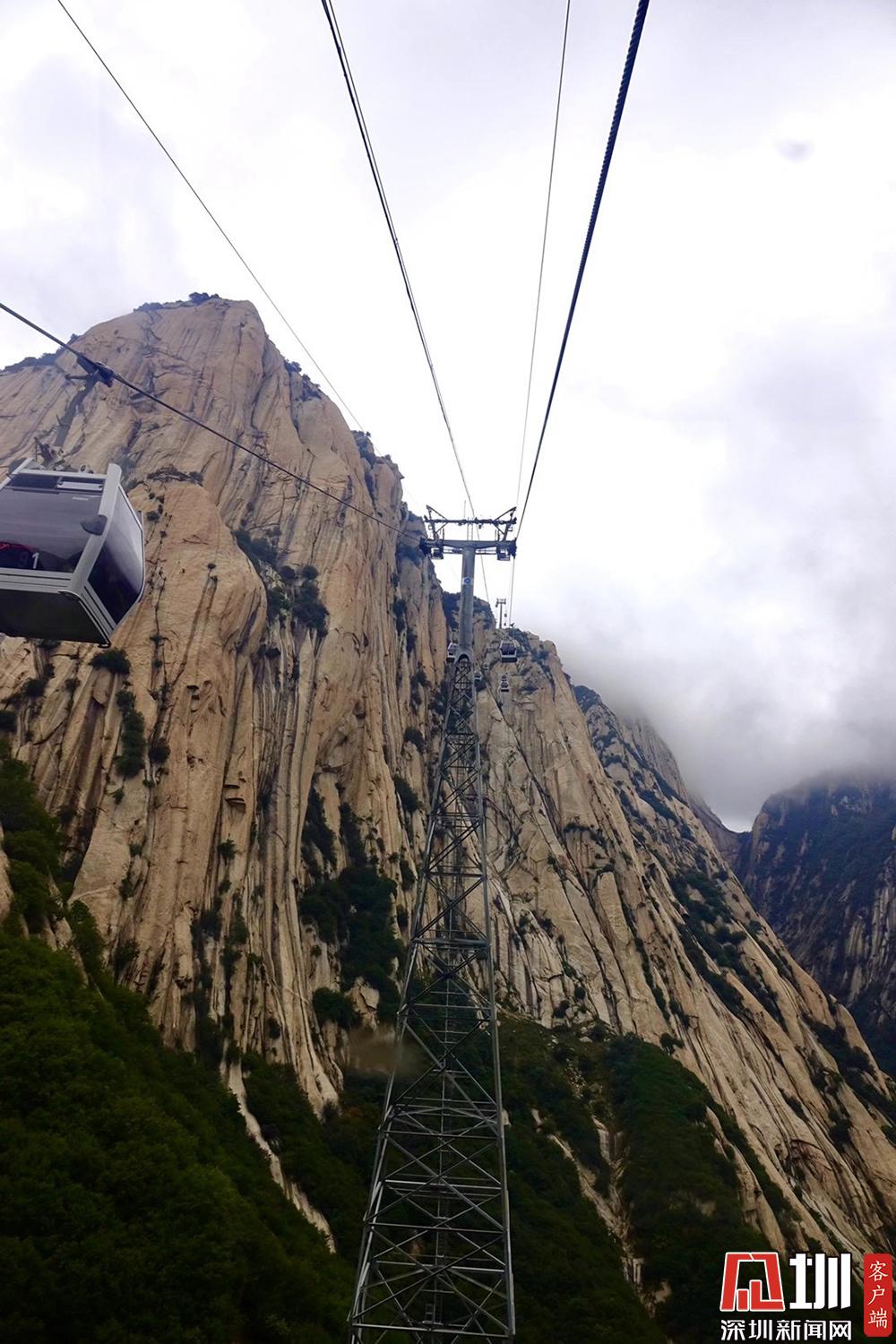 華山西峰的太華索道是迄今為止世界上第一條采取崖壁開鑿硐室站房、兩上兩下的起伏式走向、設中間站的單線循環(huán)脫掛式索道,總計投資5億余元建設。李酮攝。