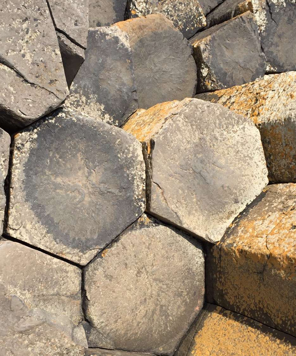 約五千萬年前,在今天蘇格蘭西部內(nèi)赫布里底群島一線至北愛爾蘭東部火山非常活躍,一股股玄武巖巖熔流從裂隙的地殼中涌出,隨著灼熱的熔巖冷卻收縮,結(jié)晶的時(shí)候,開始爆裂呈規(guī)則的六邊形形態(tài)。李仁奇 攝