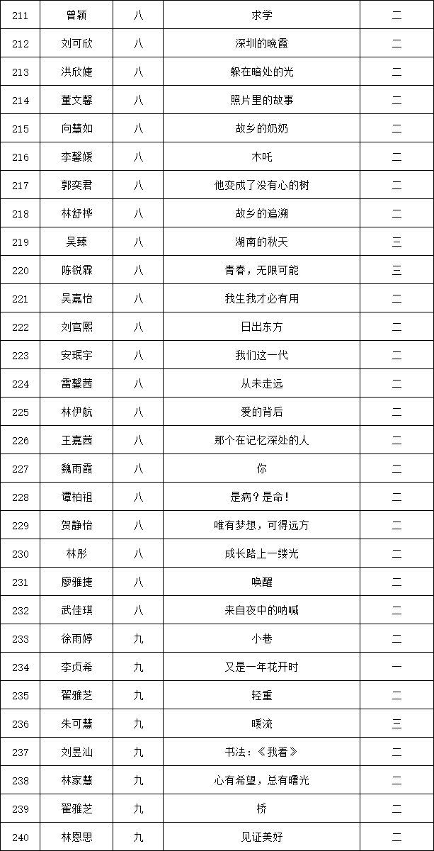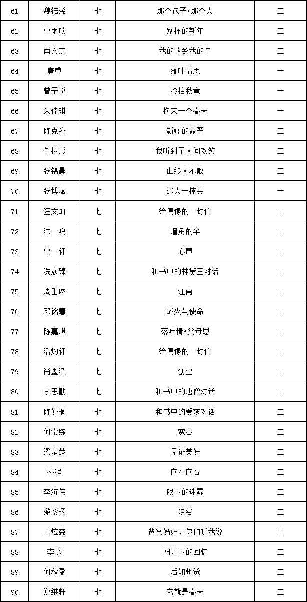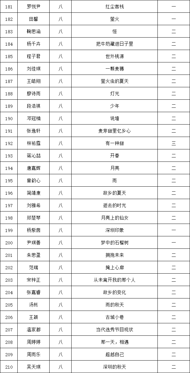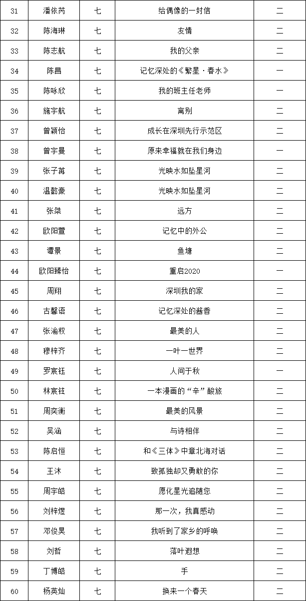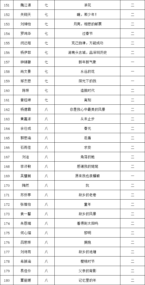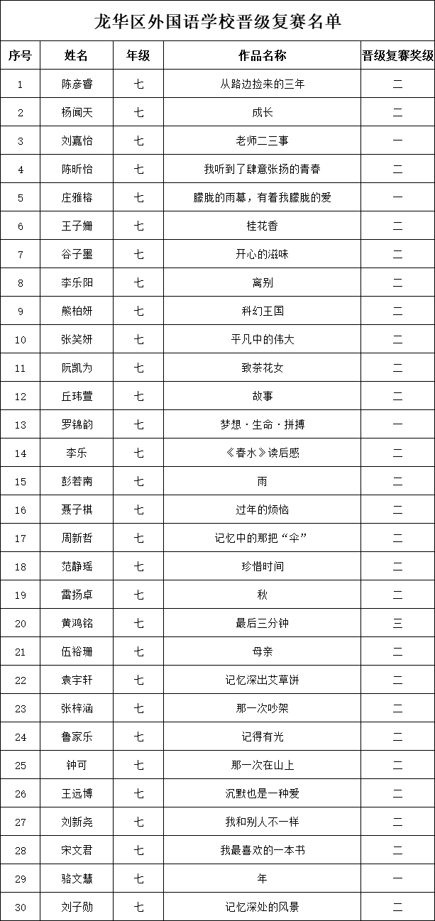 自2021年1月,活動征稿啟動以來,獲得了深圳市廣大中小學生、教師、文學愛好者的熱烈響應積極參與,吸引了深圳百余所學校的上萬人關注報名。現(xiàn)公布龍華區(qū)外國語學校專場晉級復賽名單如下: