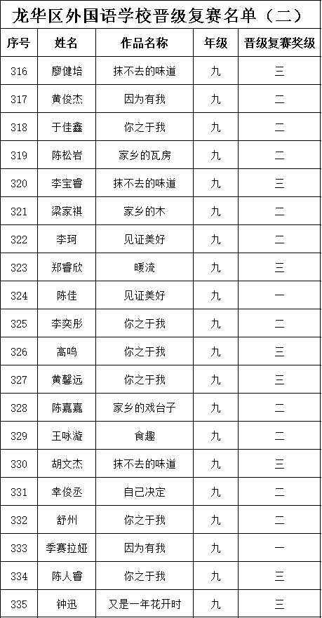 自2021年1月,活動(dòng)征稿啟動(dòng)以來(lái),獲得了深圳市廣大中小學(xué)生、教師、文學(xué)愛(ài)好者的熱烈響應(yīng)積極參與,吸引了深圳百余所學(xué)校的上萬(wàn)人關(guān)注報(bào)名?,F(xiàn)公布龍華區(qū)外國(guó)語(yǔ)學(xué)校專(zhuān)場(chǎng)晉級(jí)復(fù)賽名單如下: