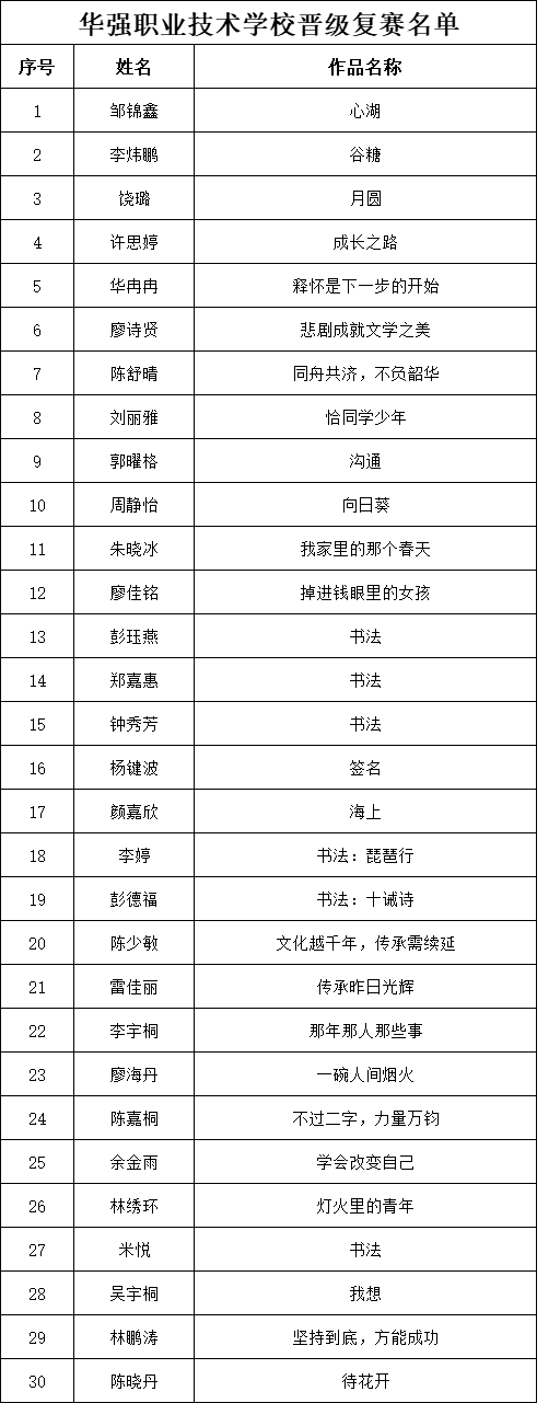 自2021年1月,活動征稿啟動以來,獲得了深圳市廣大中小學(xué)生、教師、文學(xué)愛好者的熱烈響應(yīng)積極參與,吸引了深圳百余所學(xué)校的上萬人關(guān)注報名?,F(xiàn)公布福田區(qū)華強職業(yè)技術(shù)學(xué)校專場晉級復(fù)賽名單如下: