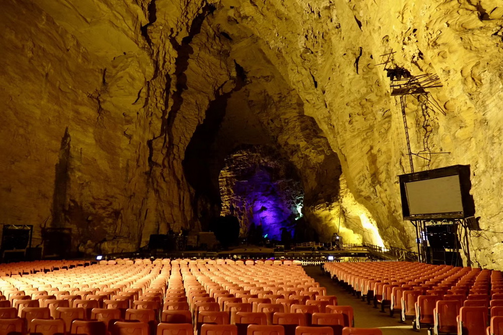 旱洞里現(xiàn)在有兩個劇場,有定時的激光和歌舞表演。水洞里有地下瀑布10余處。李仁奇 攝