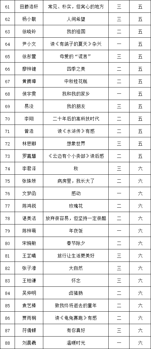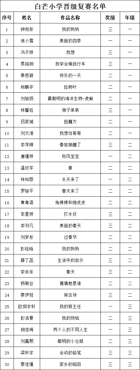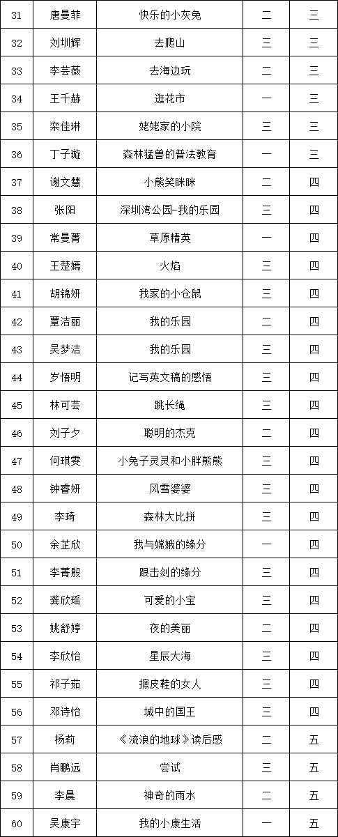 自2021年1月,活動(dòng)征稿啟動(dòng)以來(lái),獲得了深圳市廣大中小學(xué)生、教師、文學(xué)愛好者的熱烈響應(yīng)積極參與,吸引了深圳百余所學(xué)校的上萬(wàn)人關(guān)注報(bào)名。現(xiàn)公布深圳市南山實(shí)驗(yàn)教育集團(tuán)白芒小學(xué)專場(chǎng)晉級(jí)復(fù)賽名單如下: