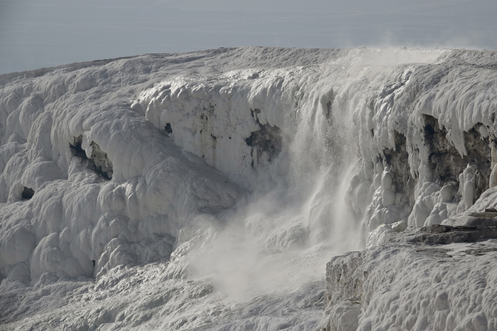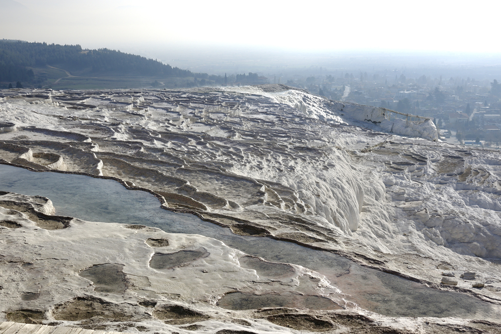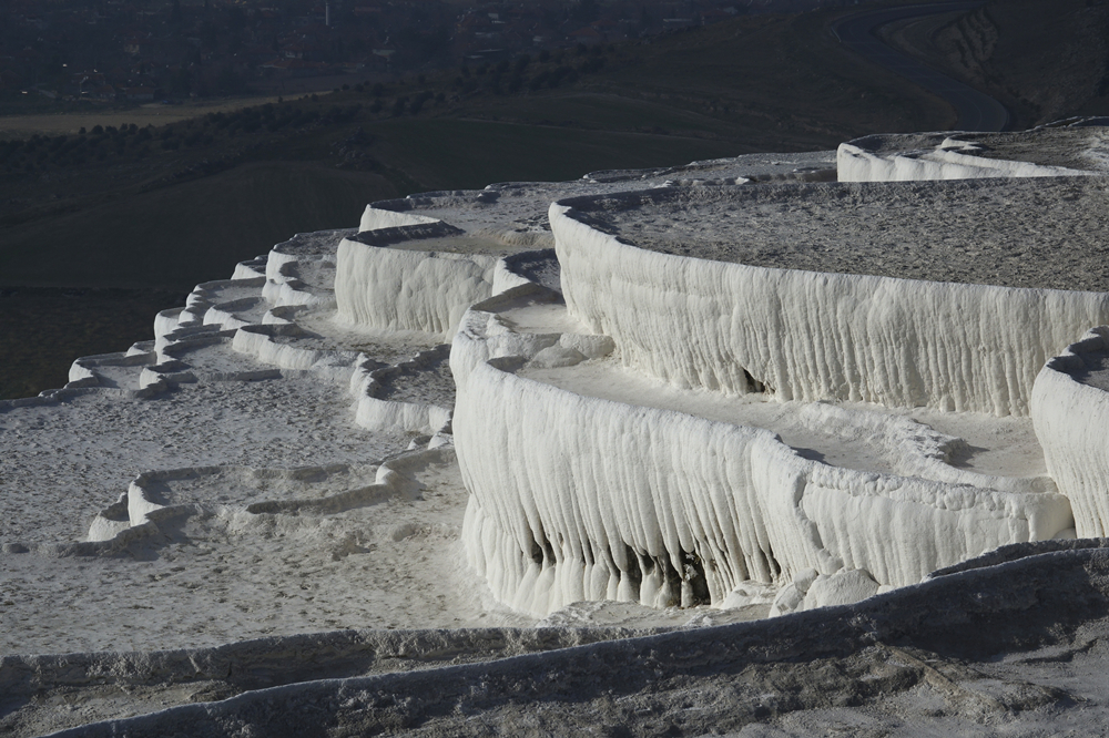 終年維持?jǐn)z氏29度的溫泉水在山崖上經(jīng)過億萬年流動(dòng),其中的礦物質(zhì)沉淀下來,把整個(gè)山坡染成白色的露天溶巖,遠(yuǎn)看形似堆積如山的棉花,一腳踩上去,才知道是堅(jiān)硬的白色石灰?guī)r。由于一層又一層的巖石形狀很像城堡,故得名棉花堡。李仁奇 攝