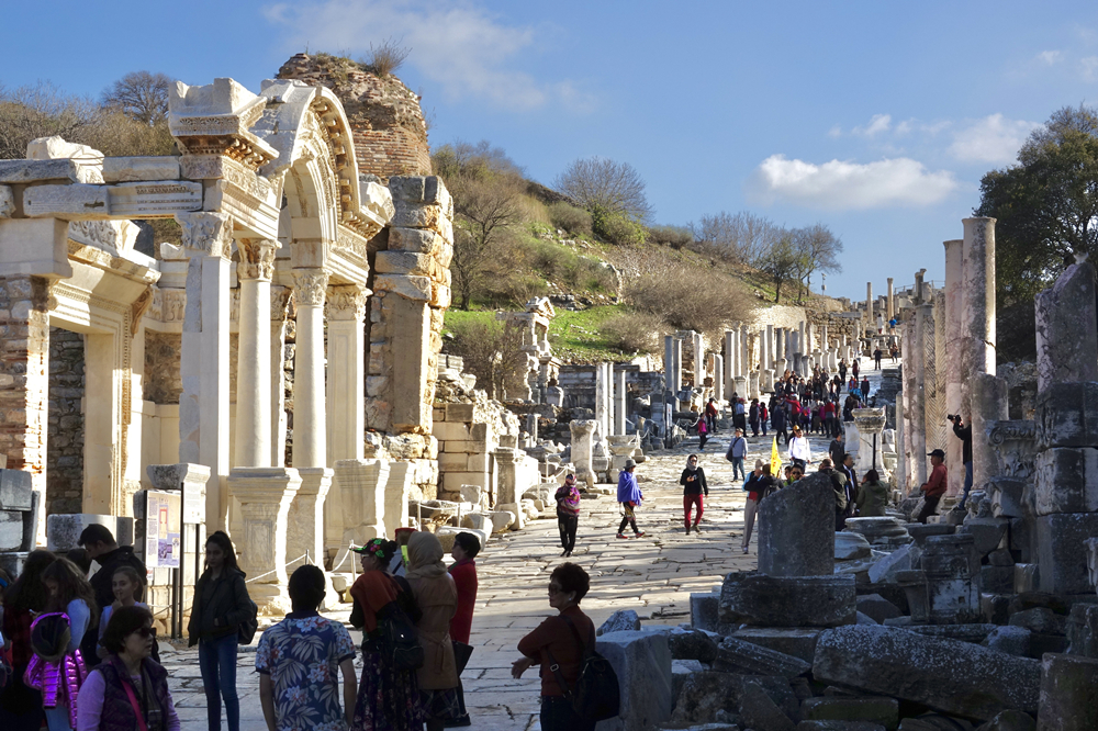 公元前334年,亞歷山大大帝把以弗所納入希臘帝國(guó)的版圖。在它的全盛時(shí)期,水管和污水管道都裝置在大理石石板的下面,50盞街燈掛在廊柱上照明,這應(yīng)該是世界上最古老的街燈。兩邊有很多商鋪,至今在地面上可以看到被馬車壓過(guò)的車輪印記。它以阿爾忒彌斯神廟(女神狄安娜的首要神龕)、圖書(shū)館和戲院著稱。李仁奇 攝