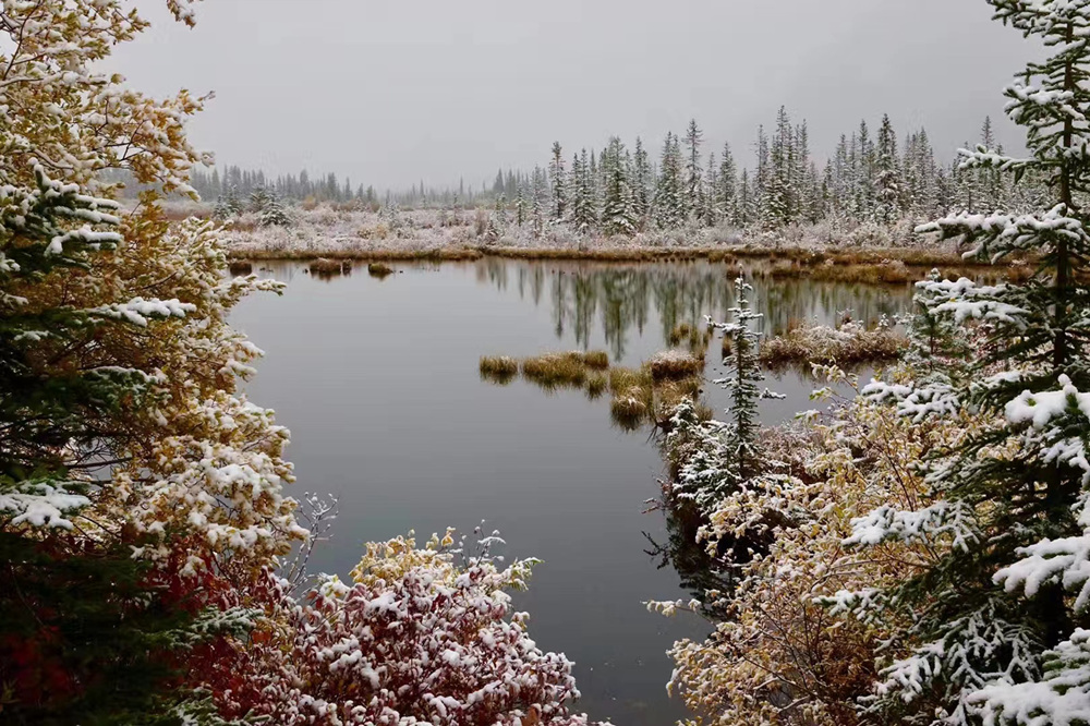 秋季是班夫最美的季節(jié),像九寨溝一樣,在藍色湖泊、綠色叢林之外,又多出了紅色和黃色的樹葉,映襯在白色的雪山之中,呈現(xiàn)出一個五彩繽紛的世界。李仁奇 攝