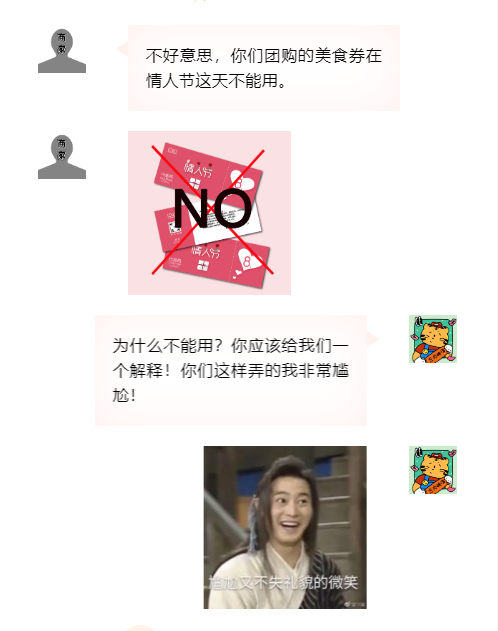 遇到春節(jié)、情人節(jié)等特殊時期,消費者在團(tuán)購時應(yīng)當(dāng)看清使用期限,如商家未提前說明美食券的限用日期,而是去到現(xiàn)場才告知消費者不能使用,則商家涉嫌侵害消費者的知情權(quán)、公平交易權(quán)。如商家銷售美食券的頁面,注明情人節(jié)不能使用,此時商家盡到了提醒義務(wù),消費者可在規(guī)定的其他時間內(nèi)使用美食券,或者向平臺申請退款。(消費提示:消費者購買團(tuán)購券時,要仔細(xì)閱讀團(tuán)購頁面的使用說明,特別是要仔細(xì)瀏覽團(tuán)購券使用時限。限用人數(shù)等具體內(nèi)容,避免遭遇買了卻用不了的困境。)