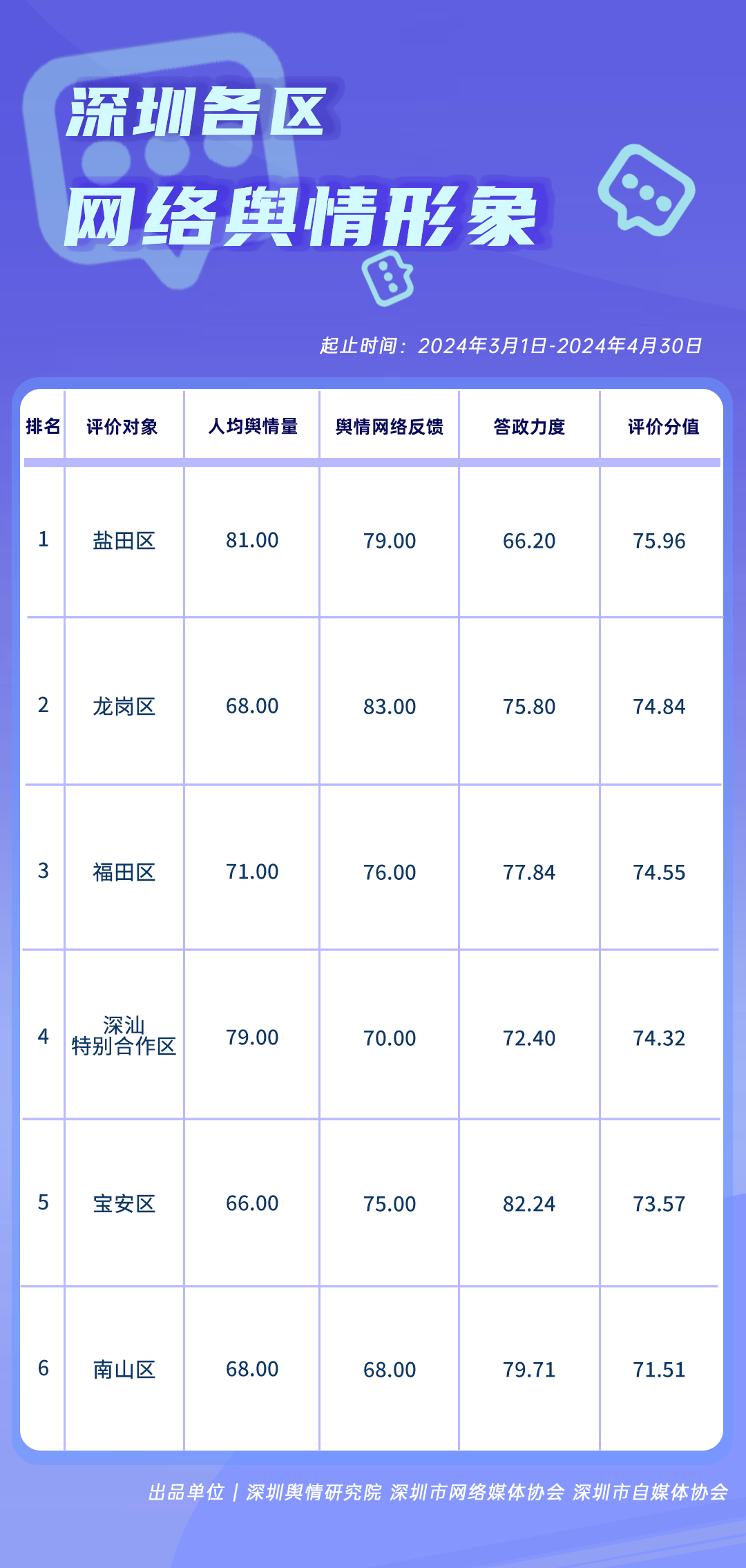 3-4月,福田區(qū)、龍崗區(qū)、南山區(qū)、鹽田區(qū)、大鵬新區(qū)、深汕特別合作區(qū)的網(wǎng)絡(luò)形象建設(shè)工作頗具成效,依次登上《深圳各區(qū)網(wǎng)絡(luò)形象建設(shè)榜》。其中,福田區(qū)榮登榜首,綜合形象得分為81.95分,且新媒體傳播形象得分達96.33分,展現(xiàn)出其以新媒體形象塑造為著力點,推進綜合網(wǎng)絡(luò)形象建設(shè)工作的一面。緊隨其后的是龍崗區(qū),綜合形象得分接近80分,整體表現(xiàn)領(lǐng)先于其他多區(qū),說明龍崗區(qū)在完善基層治理體系、維護良好網(wǎng)絡(luò)口碑等方面作出了較大努力。居于榜單第三至六名的南山區(qū)、鹽田區(qū)、大鵬新區(qū)和深汕特別合作區(qū),在網(wǎng)絡(luò)形象建立及優(yōu)化方面也具有可圈可點的表現(xiàn),如鹽田區(qū)積極完善民生保障制度,賦能群眾美好生活,提升群眾的社會生活滿意度,南山區(qū)則借力政務(wù)新媒體矩陣,持續(xù)深化政務(wù)信息傳播工作,擴大新媒體矩陣影響力。