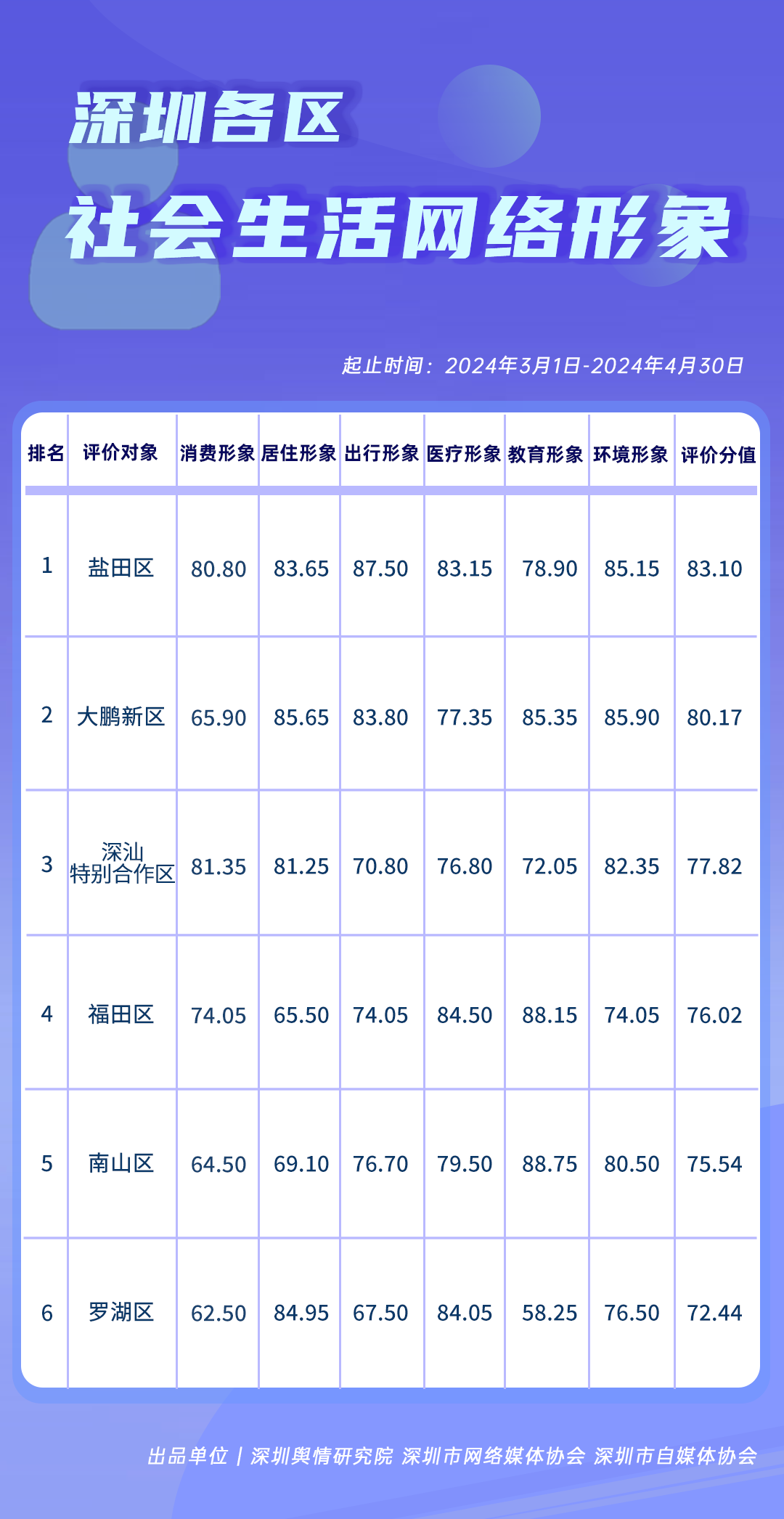 3-4月《深圳各區(qū)社會生活網(wǎng)絡(luò)形象榜》顯示,位居榜單第一名的鹽田區(qū),評價分值為83.10分,且消費、居住、出行、醫(yī)療和環(huán)境形象方面均高于80分,整體社會生活網(wǎng)絡(luò)形象較佳。緊隨其后的大鵬新區(qū)在居住、教育和環(huán)境形象建設(shè)方面,取得的分數(shù)都高于85分,表明該區(qū)在打造優(yōu)美宜居生活環(huán)境過程中收獲了較好反饋。位列第三的深汕特別合作區(qū),在消費、居住、環(huán)境形象方面表現(xiàn)也相對較好,得分均在80分以上,助推其社會生活網(wǎng)絡(luò)形象綜合得分走高。福田區(qū)、南山區(qū)、羅湖區(qū)分別占據(jù)了榜單第四,第五和第六的位置,評價分值依次為76.02分、75.54分、72.44分,綜合水平良好,后續(xù)若能充分發(fā)揮優(yōu)勢,著力補齊短板,排名有望持續(xù)提升。