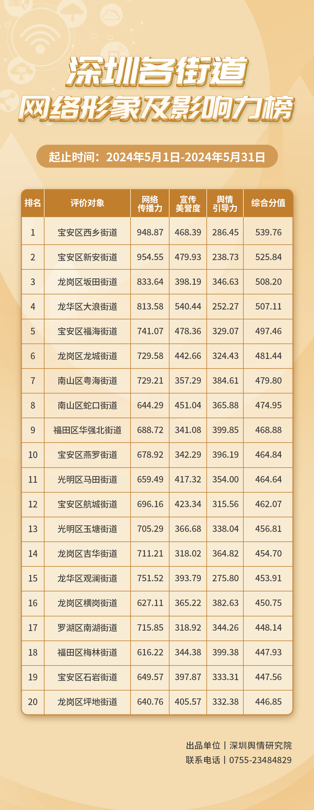 2024年5月,多街道線上線下同頻共振,努力建設(shè)“品質(zhì)街道”,積極打造“示范街道”,哪些街道表現(xiàn)較優(yōu)?讓我們通過《深圳各街道網(wǎng)絡(luò)形象及影響力榜》(5月榜單)一窺究竟。本期榜單數(shù)據(jù)統(tǒng)計(jì)范圍為2024年5月1日至5月31日。