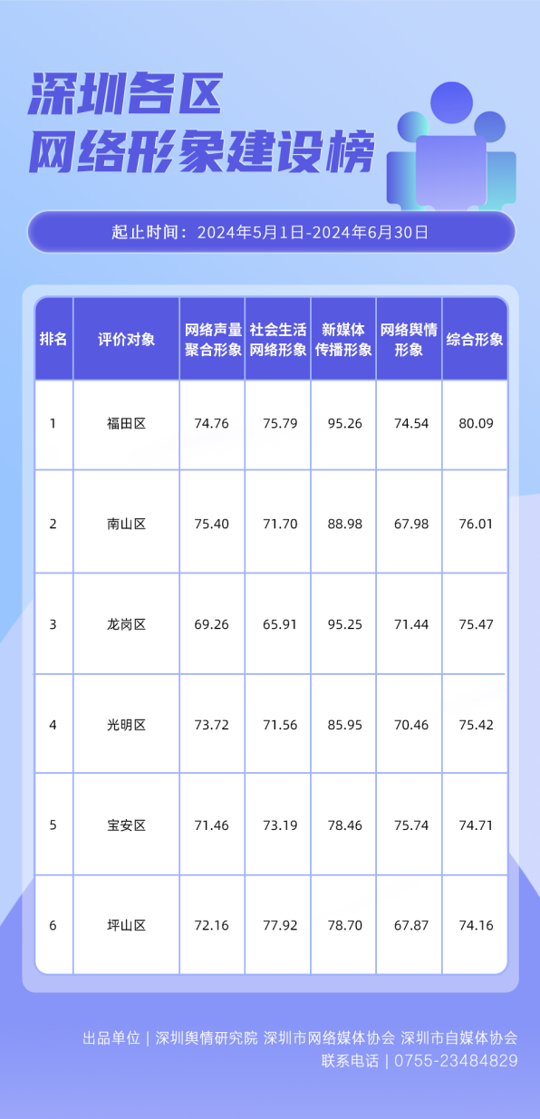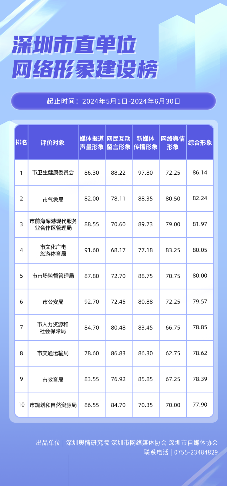 為全面評(píng)估深圳各區(qū)各單位網(wǎng)絡(luò)形象建設(shè)情況,助力各區(qū)各單位持續(xù)響應(yīng)居民對(duì)美好生活的期許,賦能城市高質(zhì)量發(fā)展,深圳輿情研究院、深圳市網(wǎng)絡(luò)媒體協(xié)會(huì)、深圳市自媒體協(xié)會(huì)聯(lián)合推出“深圳各區(qū)各單位網(wǎng)絡(luò)形象建設(shè)榜”,從網(wǎng)絡(luò)聚合聲量、留言互動(dòng)成效、社會(huì)生活評(píng)價(jià)、輿情管理能力及新媒體傳播水平等方面,多維度分析深圳各區(qū)(含大鵬新區(qū)、深汕特別合作區(qū))、各市直單位(市直屬單位、直屬部門(mén))的網(wǎng)絡(luò)形象建設(shè)成果,凸顯各區(qū)各單位的“共性”與“個(gè)性”。