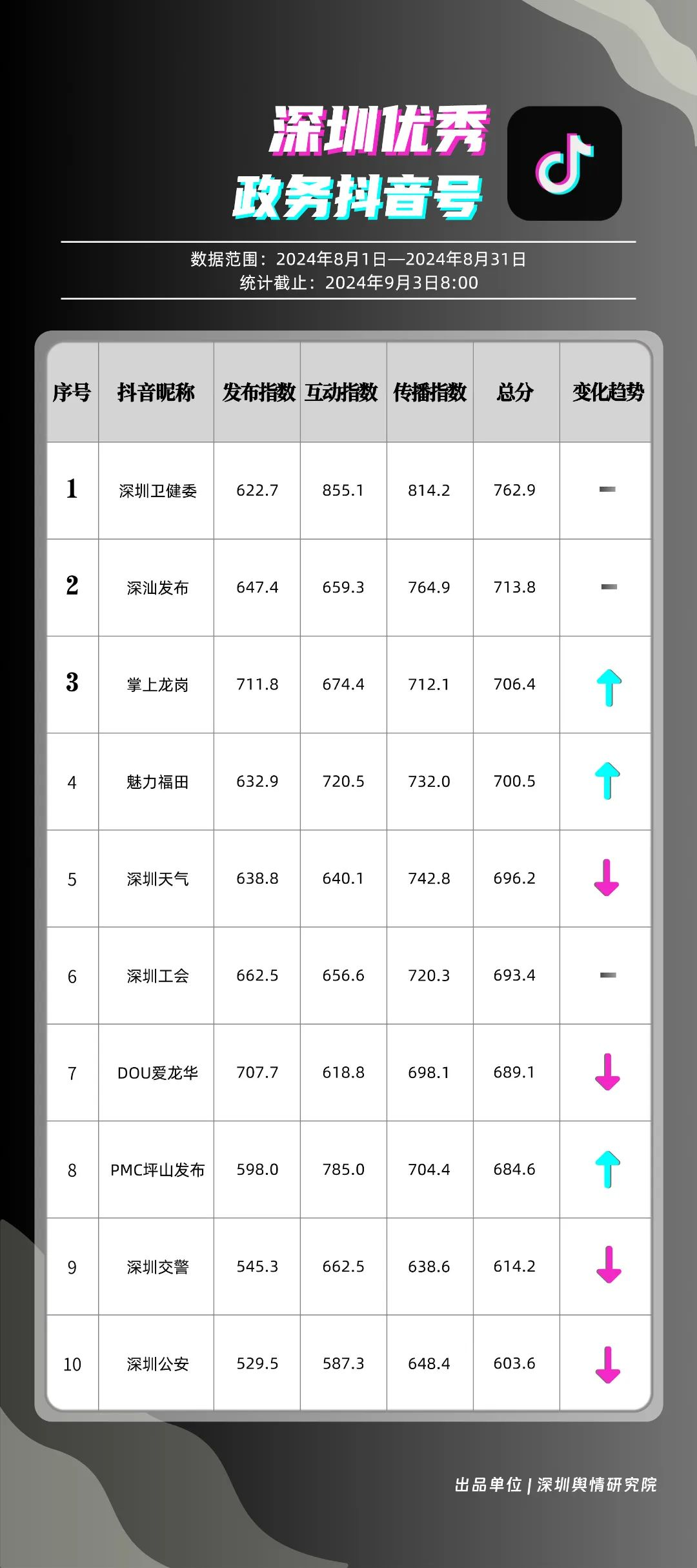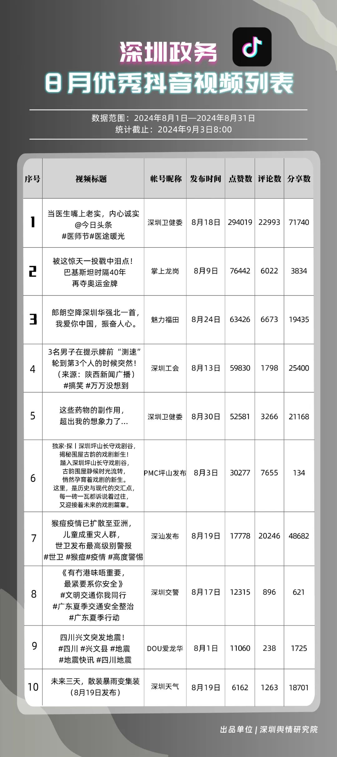8月,“深圳衛(wèi)健委”“深汕發(fā)布”“掌上龍崗”“魅力福田”“深圳天氣”“深圳工會(huì)”“DOU愛(ài)龍華”“PMC坪山發(fā)布”“深圳交警”和“深圳公安”共10個(gè)政務(wù)抖音號(hào)獲得優(yōu)秀稱(chēng)號(hào),“深圳衛(wèi)健委”“深汕發(fā)布”“掌上龍崗”以高分居榜單前三,賬號(hào)有關(guān)“醫(yī)師節(jié)”“猴痘”“奧運(yùn)金牌”的視頻獲得了較高的關(guān)注度和討論度,相關(guān)優(yōu)秀視頻在傳播信息的同時(shí),也展現(xiàn)了深圳政務(wù)抖音號(hào)在內(nèi)容質(zhì)量、互動(dòng)性和傳播度方面的實(shí)力。