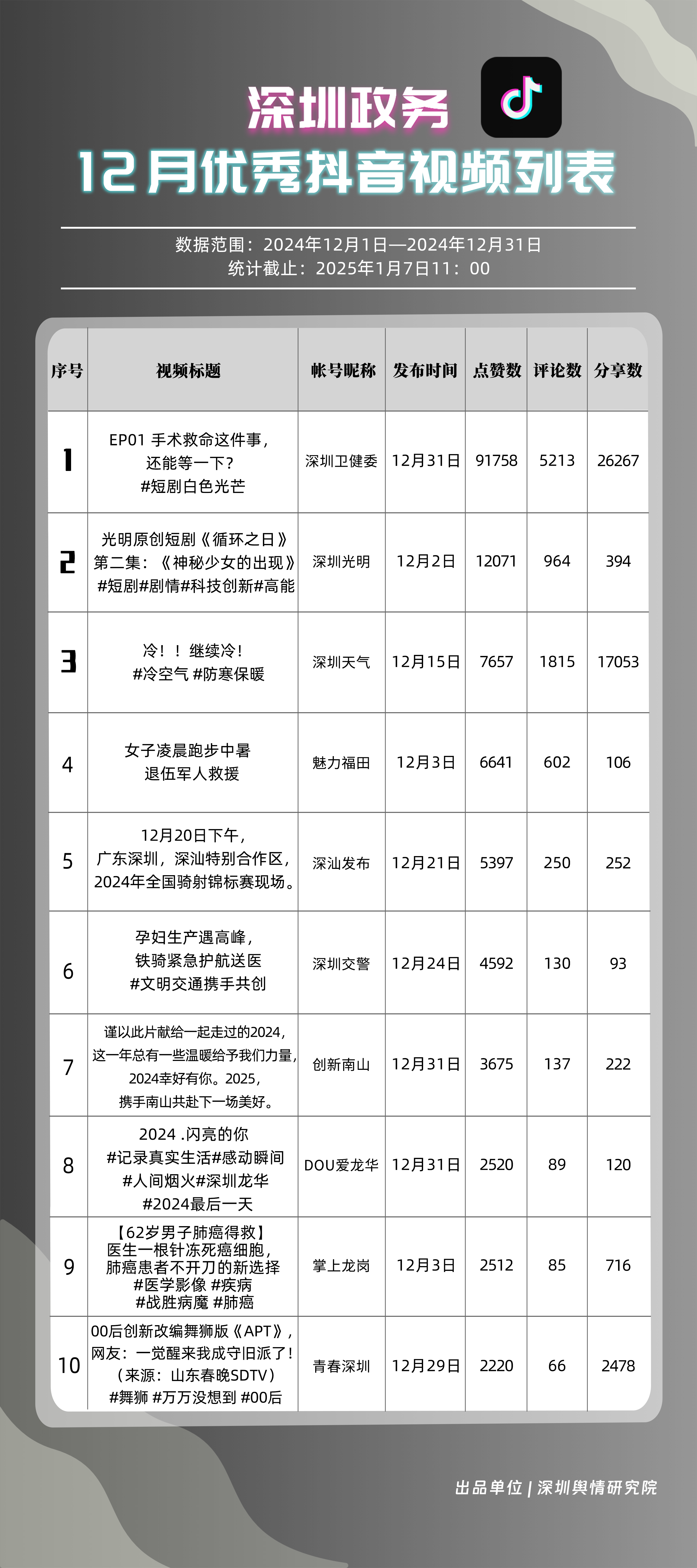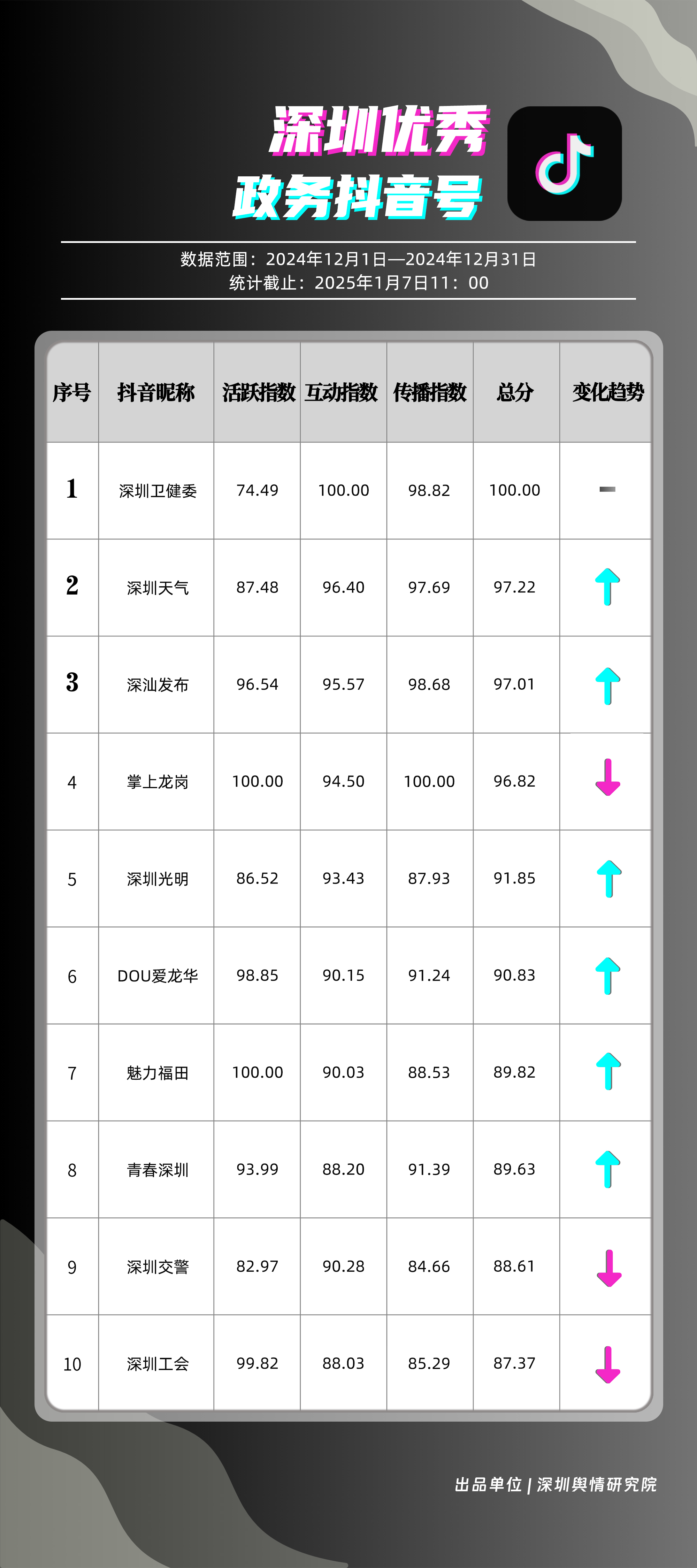 12月,“深圳衛(wèi)健委”“深圳天氣”“深汕發(fā)布”“掌上龍崗”“深圳光明”“DOU愛龍華”“魅力福田”“青春深圳”“深圳交警”“深圳工會(huì)”共10個(gè)政務(wù)抖音號獲得“深圳優(yōu)秀政務(wù)抖音號”稱號。“深圳衛(wèi)健委”在互動(dòng)、傳播方面成績優(yōu)異,助推其位于榜單首位?!吧钲谔鞖狻薄吧钌前l(fā)布”“掌上龍崗”則各有所長,綜合排名位于榜單前列,內(nèi)容產(chǎn)出豐富、用戶互動(dòng)高頻,信息傳播廣泛,共同展現(xiàn)了政務(wù)抖音號在服務(wù)公眾、提升信息傳播效能方面的顯著效能。